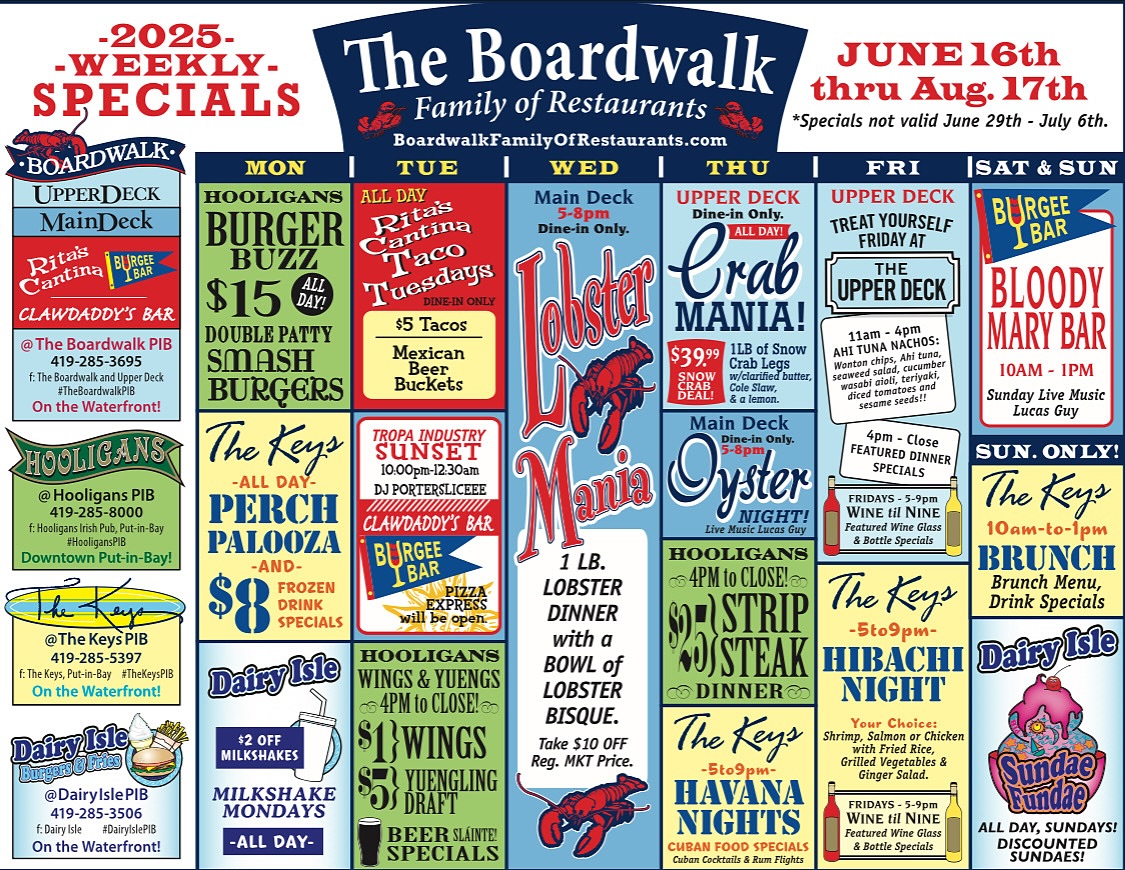 The Boardwalk Family includes The Boardwalk, Upper Deck, Main Deck, Rita’s Cantina, Clawdaddy’s Bar, Hooligans, The Keys, Dairy Isle, and Burgee Bar. With summer winding down, it’s the perfect week to soak in island views, great food, and your favorite seasonal specials one last time.