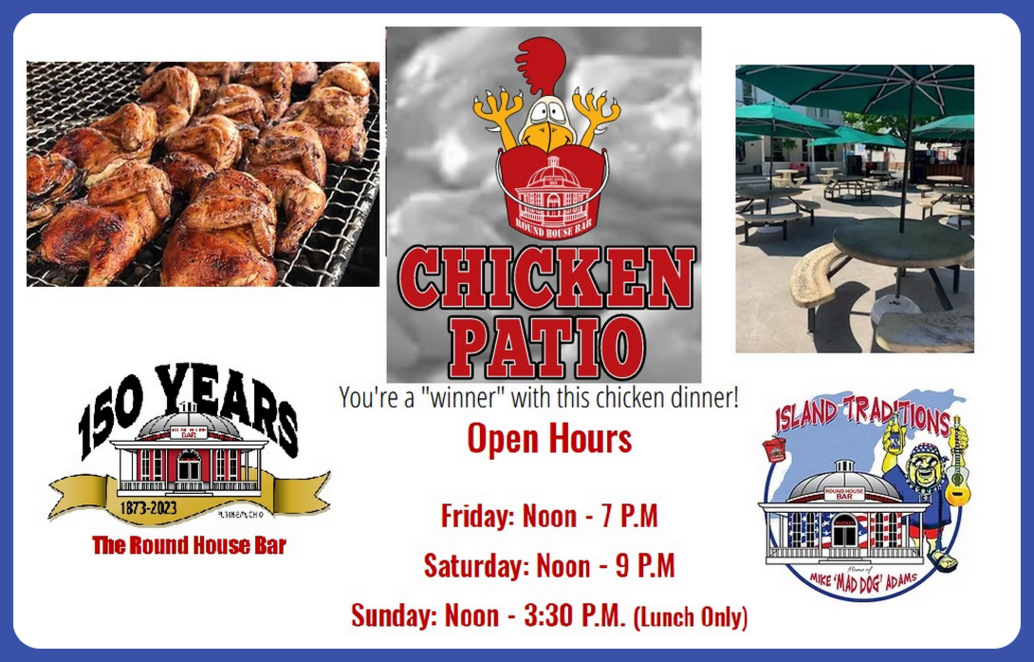 Look no further than the Chicken Patio and Round House Bar for a great night out at Put-in-Bay! Chicken Patio invites you to enjoy its famous local-wine-basted chicken dinner. This family tradition began in 1952 and continues today with chicken basted in our home-recipe and served with the sweetest corn husked daily, potato salad, and a roll.