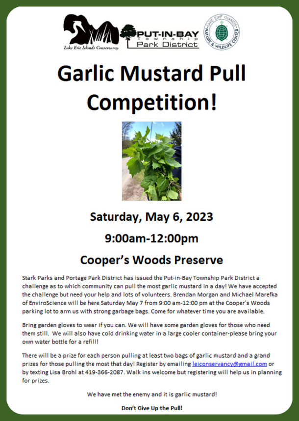 Garlic Mustard Pull Challenge with Stark and Portage Parks is this Saturday, May 6, from 9:am-noon.  Bring gloves, if you have them, and a refillable water bottle.  EnviroScience will be here to provide the bags and do the weigh in to see who can pull the most invasive garlic mustard from the Cooper’s Woods Preserve. Prizes for those who participate!