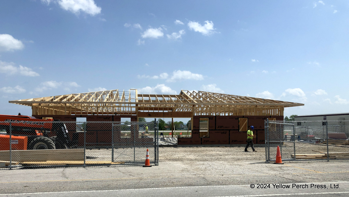 Construction on the new Put-in-Bay airport terminal moves forward. The stick-built structure now reveals the general shape of the final building. The new, modern terminal facility will be an approximately 2,500 square feet, single-story building including a public area, baggage room, mechanical room, and two restrooms.