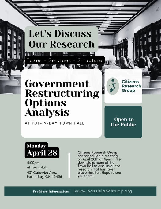 The Citizens Research Group is hosting a public meeting this afternoon, Monday, April 28, at 4:00 PM at the Put-in-Bay Town Hall, located at 431 Catawba Avenue.